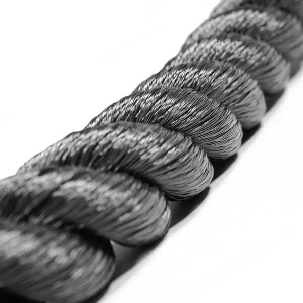 This pulldown exercise rope features a high-quality nylon construction with shiny black finish, textured grip surfaces, and a hanger in the middle for attaching to the hook/carabiner on your pulldown machine.